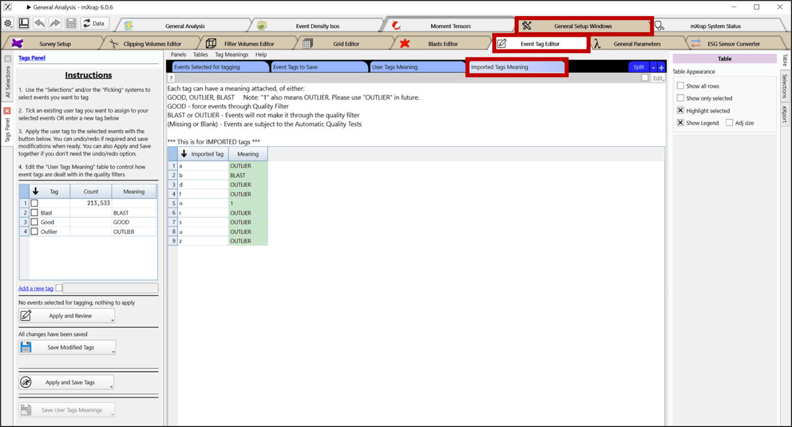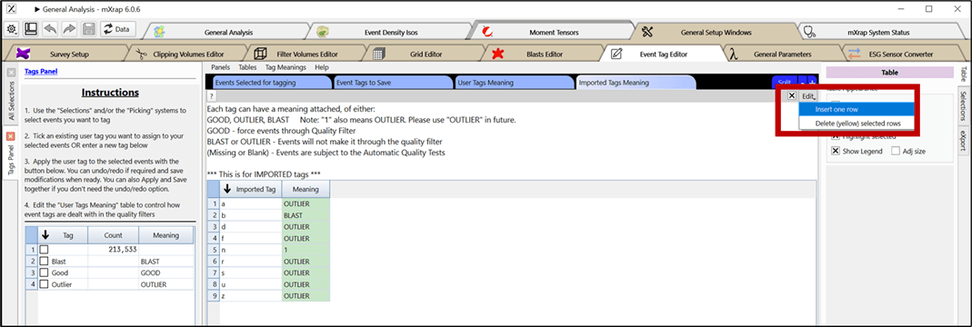 Event tags can be used to group events into categories. Example tags might be 'suspected blast', 'damage occurred', 'suspect location', 'outlier' or 'likely crusher noise'. These tags can be used in event filters to quickly show or hide particular categories.
