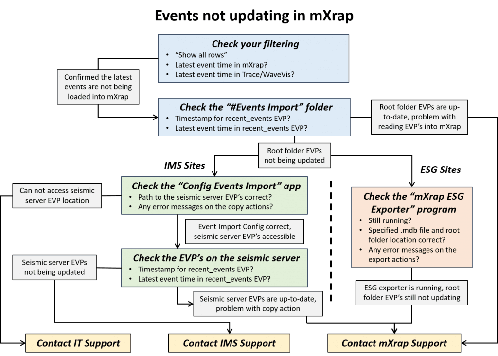 If you are able to access the evp files on the seismic server, again, check the timestamps and open the recent_events file to see what the latest event is. If these files are up-to-date, it is a problem with the copy-action from the seismic server to the root. Double check the file path in mXrap is correct and try to 'Reload Data' again. Contact for assistance if mXrap events are still not updated.