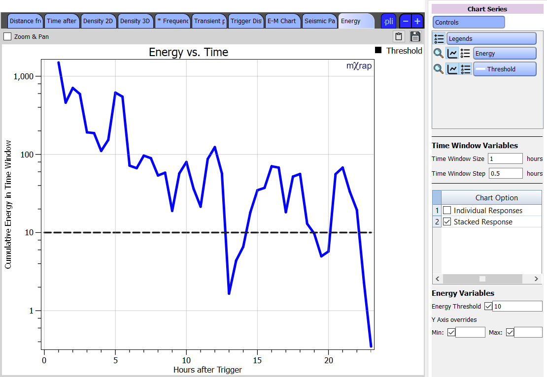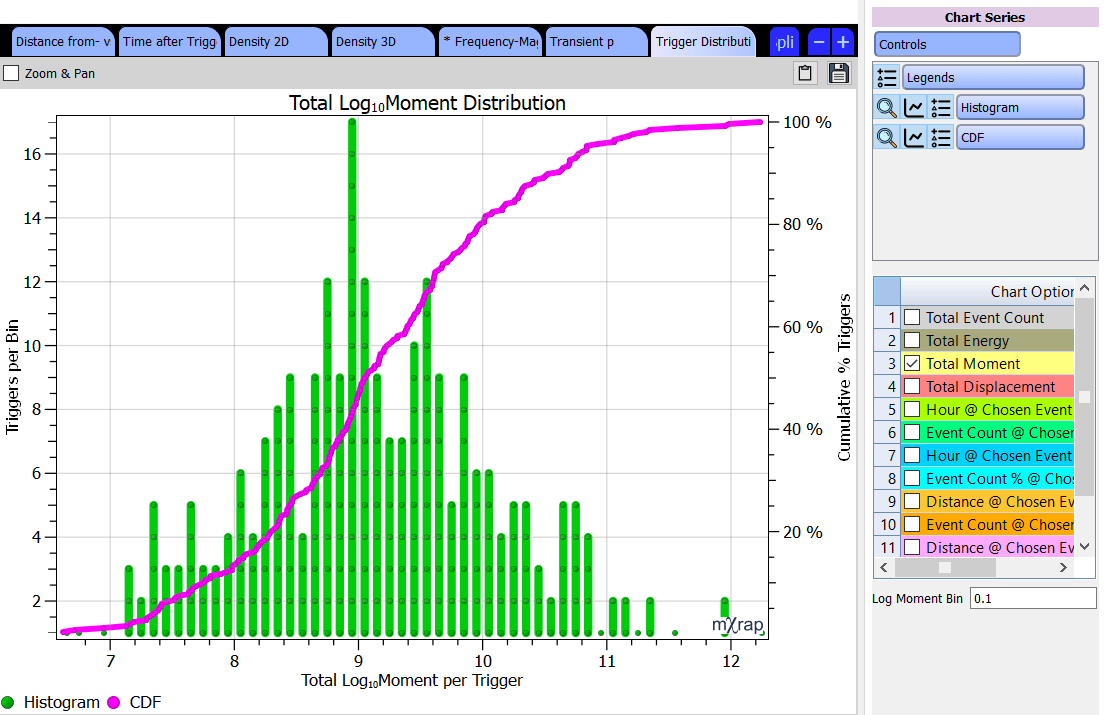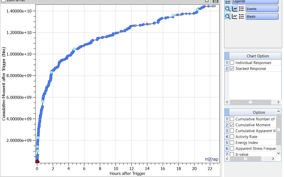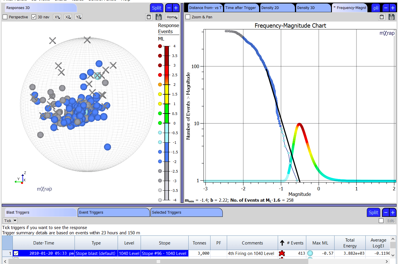 - Frequency-magnitude and log energy-log moment charts for response events: This allows you to do more detailed analysis of responses, to try to understand the underlying mechanism of the response and the distribution of events.