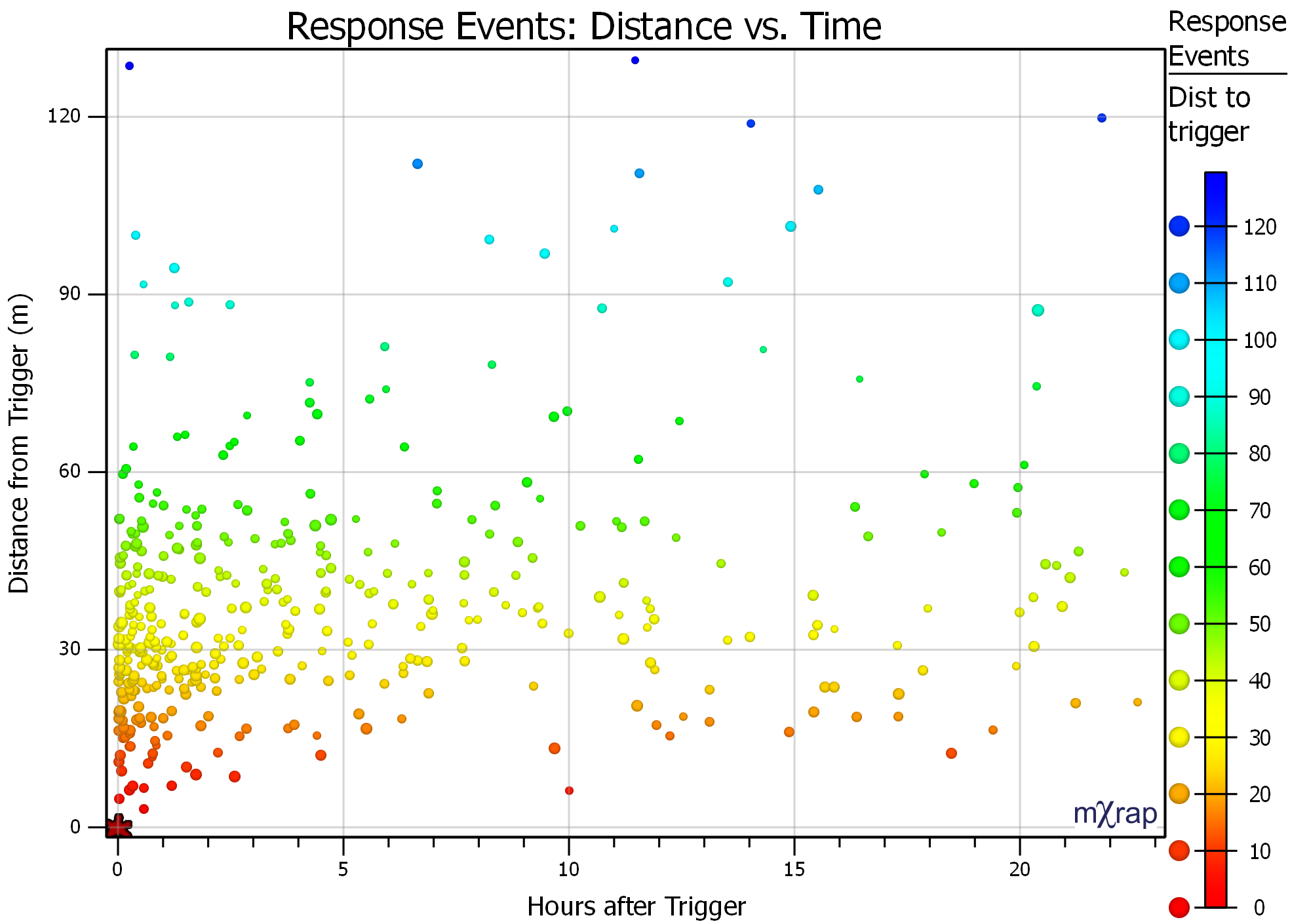 - Time versus distance to trigger chart: This allows you to investigate whether there are trends in your response seismicity dependent on the distance from the trigger.