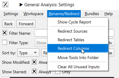 Apps that you created that are being used on site will break as a result of these broken connection in upgraded root folders. As we transition to v6 of mXrap, root upgrades will be required, and any of your custom apps will require fixing. To rectify missing sources, you can either manually change links (on an updated root folder) from the old to the new location, or use mXrap's redirect source/table/column feature in the menu bar of the Settings window: