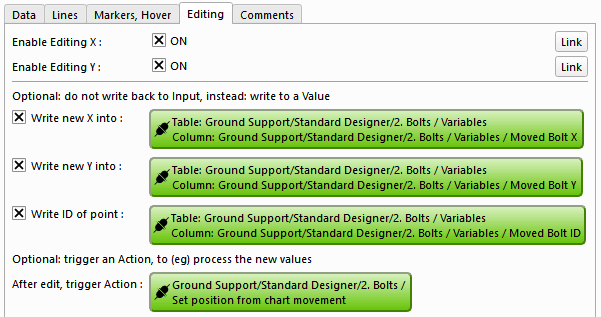 To support this case we can use the optional tools shown in the Editing tab above. When the user moves the point, the ID of the point as well as the new X and Y location are written into variables that we choose. We can then make a calculation which reads those values and uses them to calculate the correct distance along the tunnel profile. Finally, we set up an action to trigger which will copy our calculated value into the correct place for the moved point.
