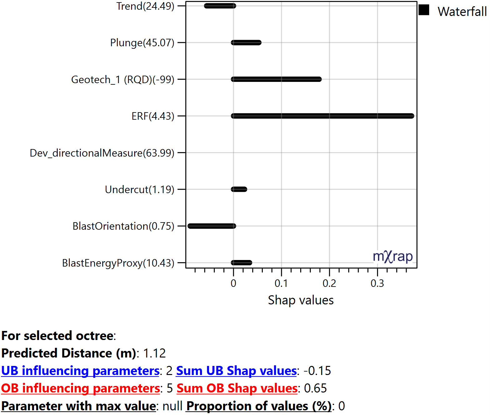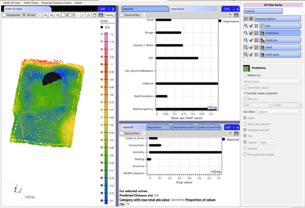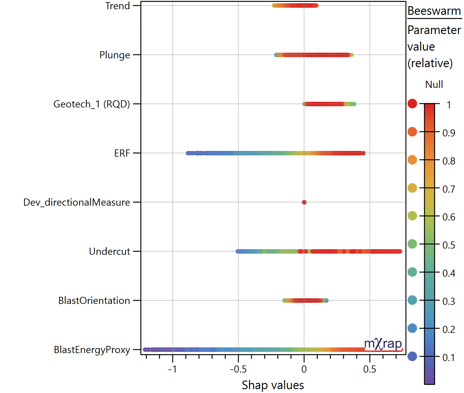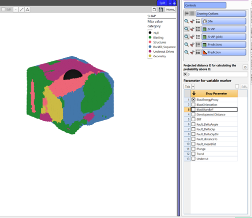Plots the SHAP values for each parameter or category and for all the octree in the stope. The marker style represents the relative distribution of that parameter value with in that stope, meaning, red represent higher values and purple lower values. It is used to understand the correlation between the SHAP value and parameter value, observing trends. Allows to identify how the parameters affect OB and UB.