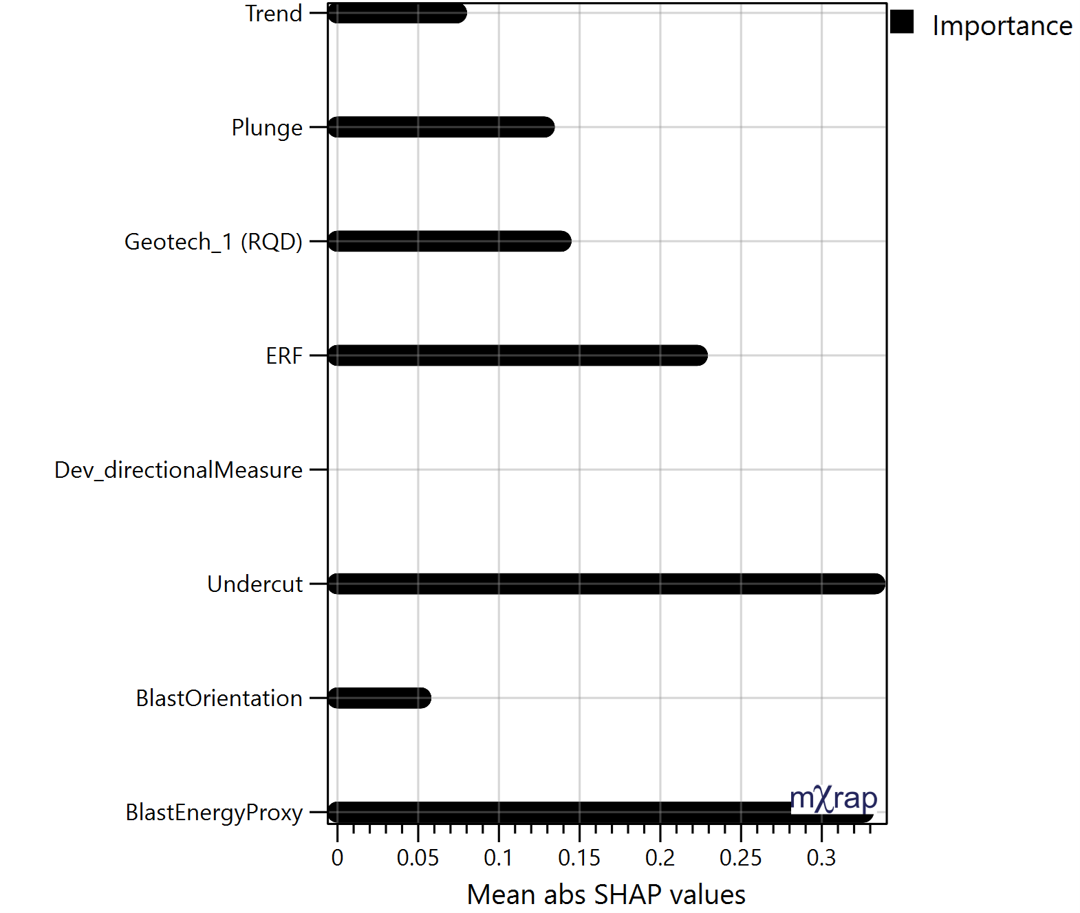 Plots the mean absolute SHAP value of all the stope octree for each parameter or category. Allows to identify which parameter have a larger impact on the predictions. These are approximate SHAP values but gives an idea of the magnitude of impact each parameter has on the stope performance. This chart can also be plotted per face.