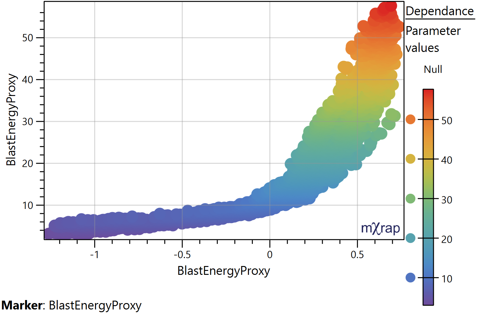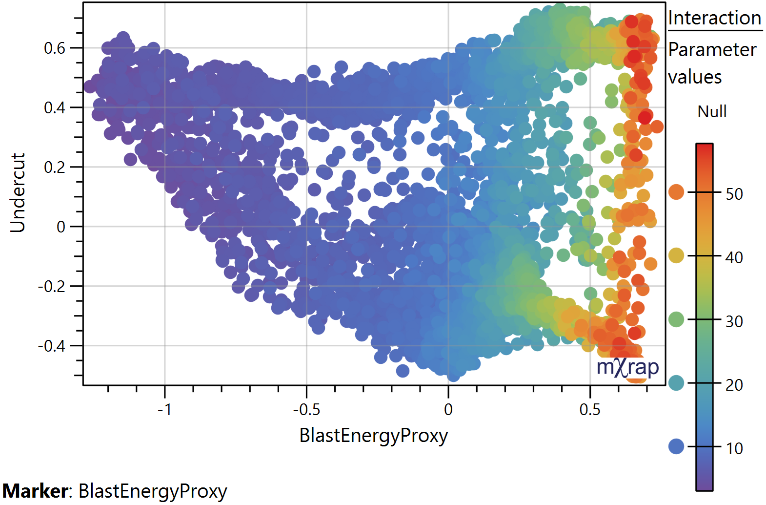 Plots the SHAP values for the selected parameter on the X axis. And the parameter values on the Y axis. The distribution of the points informs us whether there is a general trend between the parameter values and SHAP values and allows us to identify linear or non‐linear relationships. *Use the Z axis for the marker style which represent the parameters values.