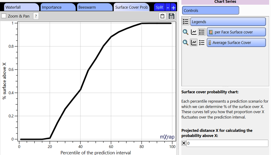 The prediction model used outputs a standard error for each prediction, which is used to generate a prediction interval. Each percentile of that interval represents a stope performance scenario and represent the same percentile used when building the model. Since multiple scenarios can be generated, we can track the percentage of octrees with a predicted distance over a given distance and build a cumulative chart which we see here. Therefore, we can analyse how that proportion of the surface above X fluctuates over the prediction interval and indicates the likelihood of exceeding the given distance and what proportion of the stope will be affected. For the example below, it can be read as there is a 60% chance (40 percentile) that at least 40% of the stope will be overbroken.