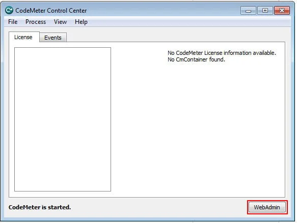 1. Your web browser should open to the CodeMeter WebAdmin page (you may get a message saying the website is not secure, proceed to the page). Ensure you are connected to the server which your silver codemeter dongle is plugged into, by clicking the server on the bottom left and selecting the correct one, then clicking Apply.