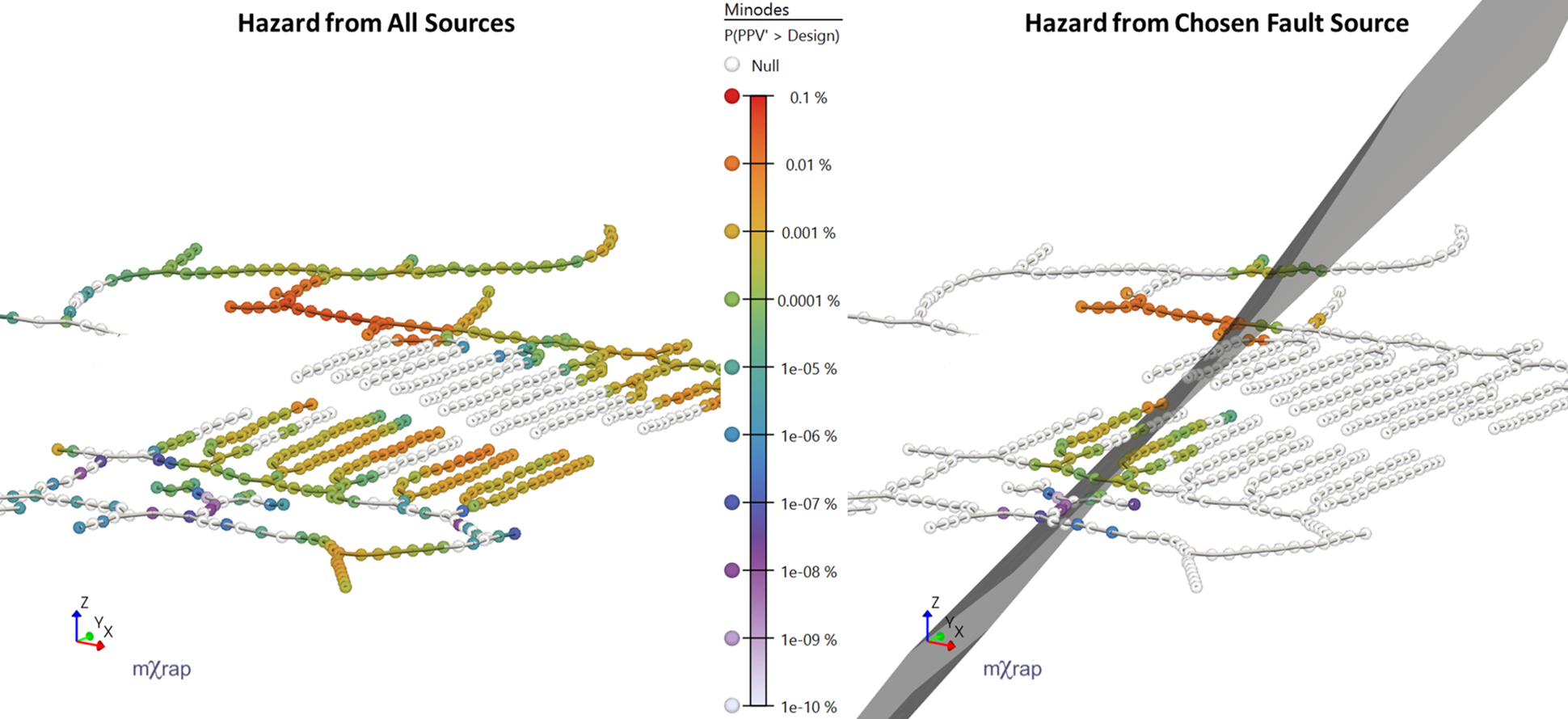 The intention of this module is to help understand which faults are triggered by nearby blasting and to quantify the hazard associated with each fault on excavations. Understanding and quantifying the role of structures on your seismicity is critical in assessing your current seismic risk, and the risk with future excavations near active faults. The app may also be useful to determine which structures should be included explicitly in numerical modelling and measured for calibration, as numerical models should reflect the seismic behaviour that is observed on key structures.