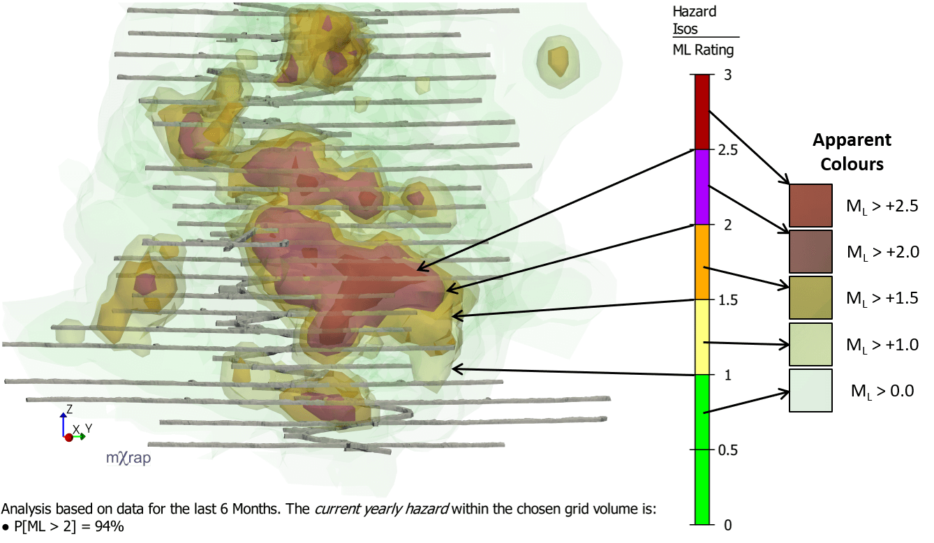 An ML rating is assigned to each grid point to compute the isosurfaces. On the surface of the ML2 iso for example, the ML rating refers to the magnitude that, to a reliability of 85%, would not be exceeded within the standard volume given one year's seismicity. The standard volume we use is that of a sphere of 50m radius.