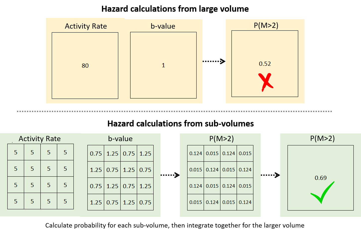 This is illustrated in the figure below. You can represent the full volume with its activity rate and b-value to compute the probabilistic hazard, like in the VTM table. In the Hazard app, the variations in activity rate and b-values are calculated on a regular grid through space (in sub-volumes). While the event search radius for each grid point may exceed the grid cell spacing, the activity rate is normalised and the b-value is assigned to represent the seismicity for the specific grid cell volume. The probability of exceeding the design magnitude within each sub-volume can then be calculated. Then the probabilistic hazard for the full volume can be calculated by integrating together all of the sub-probabilities.