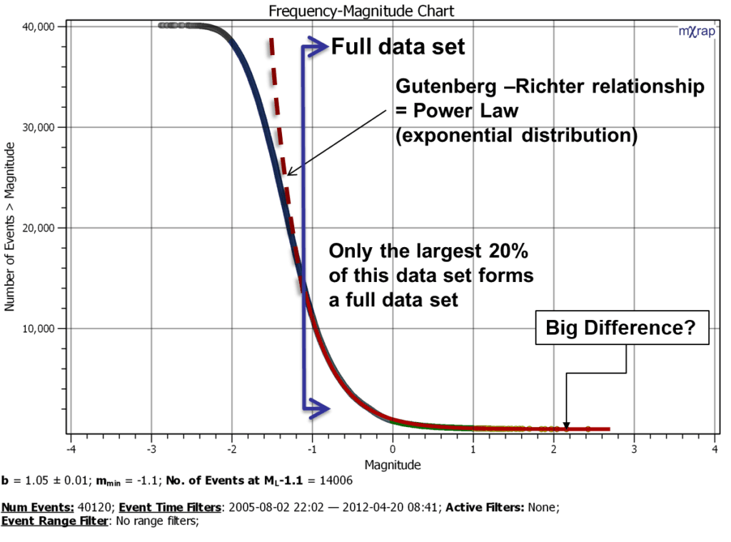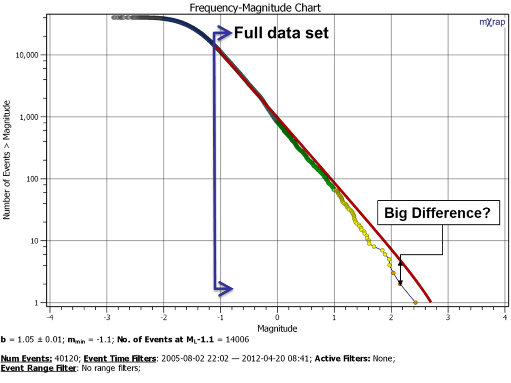 The Gutenberg-Richter distribution is a statistical model of the data. Consider what the chart looks like in linear scale rather than log scale. The difference at the tail of the distribution (largest events) seems much less significant right? The other interesting point is the relative proportion of events above and below the Mmin. There is roughly only 20% of events in you database that are above the magnitude of completeness.