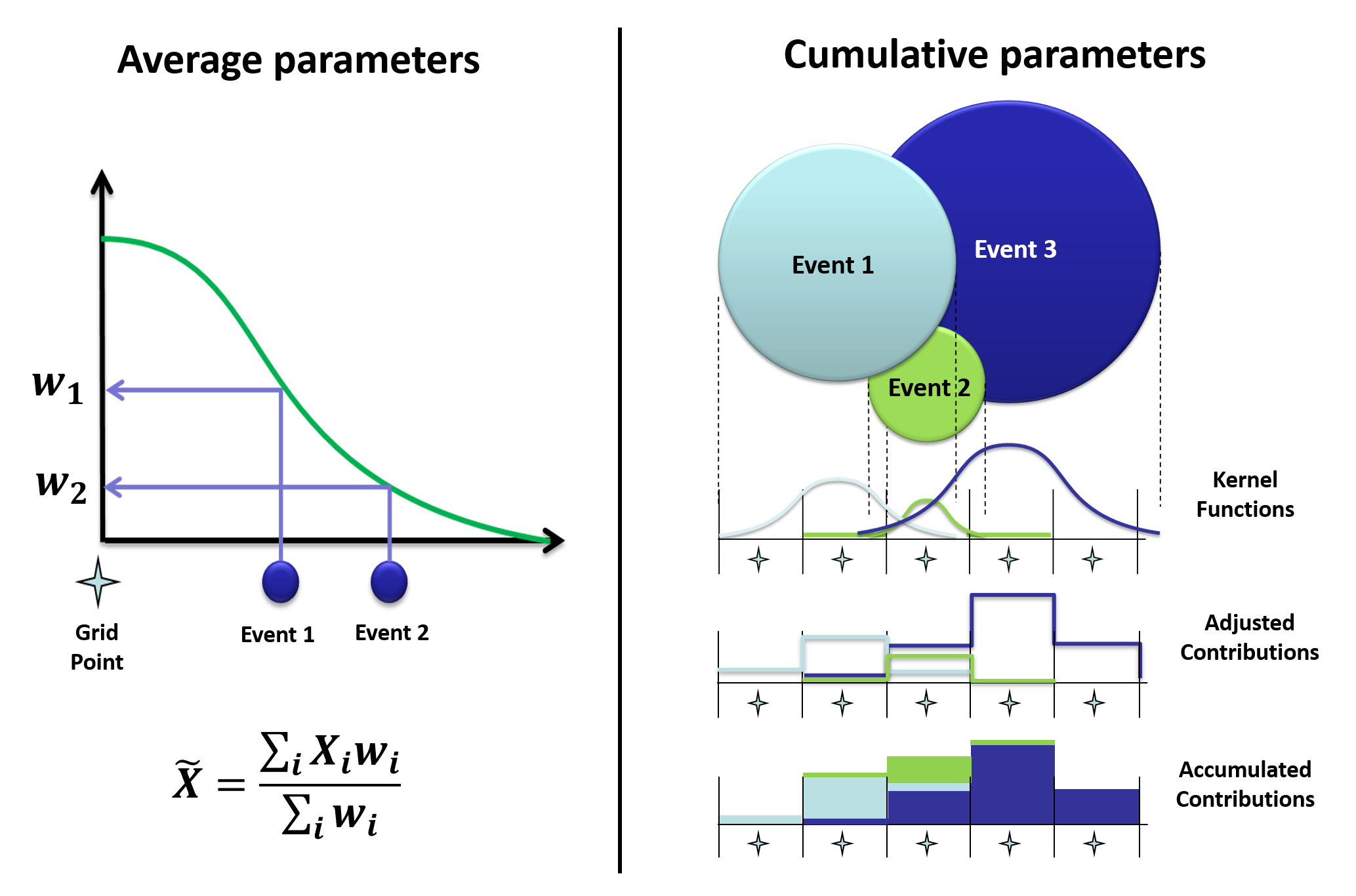 For average parameters, the inverse-distance weighted mean is calculated using the specified kernel function. For cumulative parameters, the kernel function controls how each event is distributed onto the grid cells. The contribution to each grid point is adjusted to ensure the cumulative parameters are conserved. In other words, if you compute the grid using 100 events or 1kJ of energy, the final result on the grid should also add up to 100 events or 1kJ.