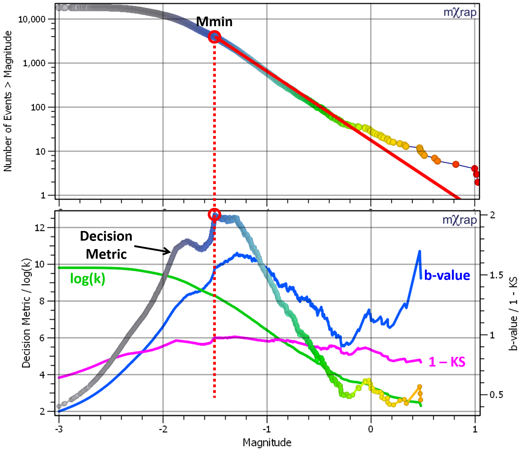 The event-grid association for the b-value calculations is the same as for the blast and shift change response ratios, i.e. not weighted by distance. A decision metric is used to find the Mmin (magnitude of completeness) for each grid point. Once the Mmin is known, the b-value can be calculated based on the average magnitude above Mmin.