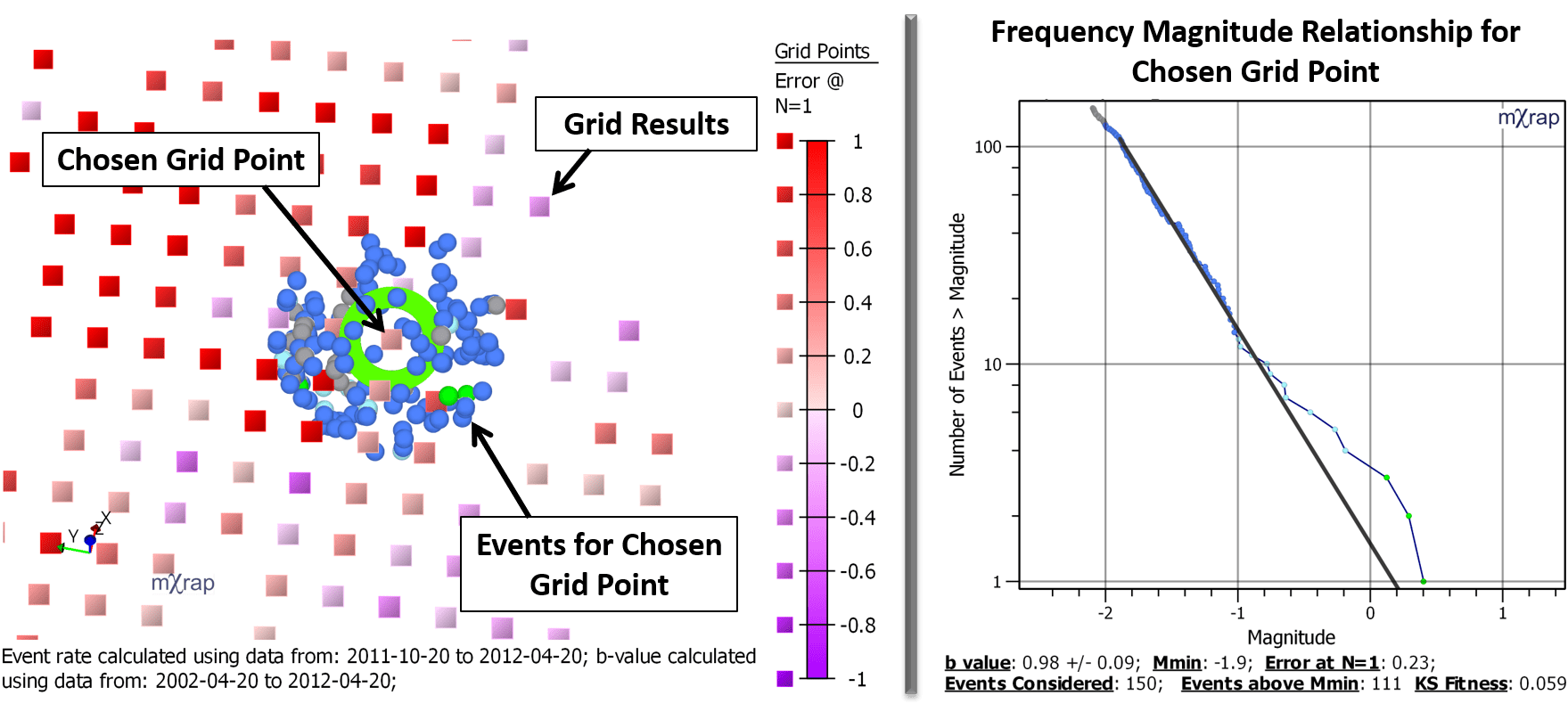 In the same window there is also a global frequency-magnitude chart. This uses all events before the backdate, throughout the whole mine. This shows the Mmin that is used for the event rate calculations. Events well below the global Mmin (Mmin - Δ) are also excluded from the b-value calculations. This is primarily to speed things up. The Δ parameter can be adjusted in the control panel but beware, it will affect the other search parameters. E.g. increasing Δ and including more small events means you will need to increase the search N to ensure you will still get the required number of events above Mmin.