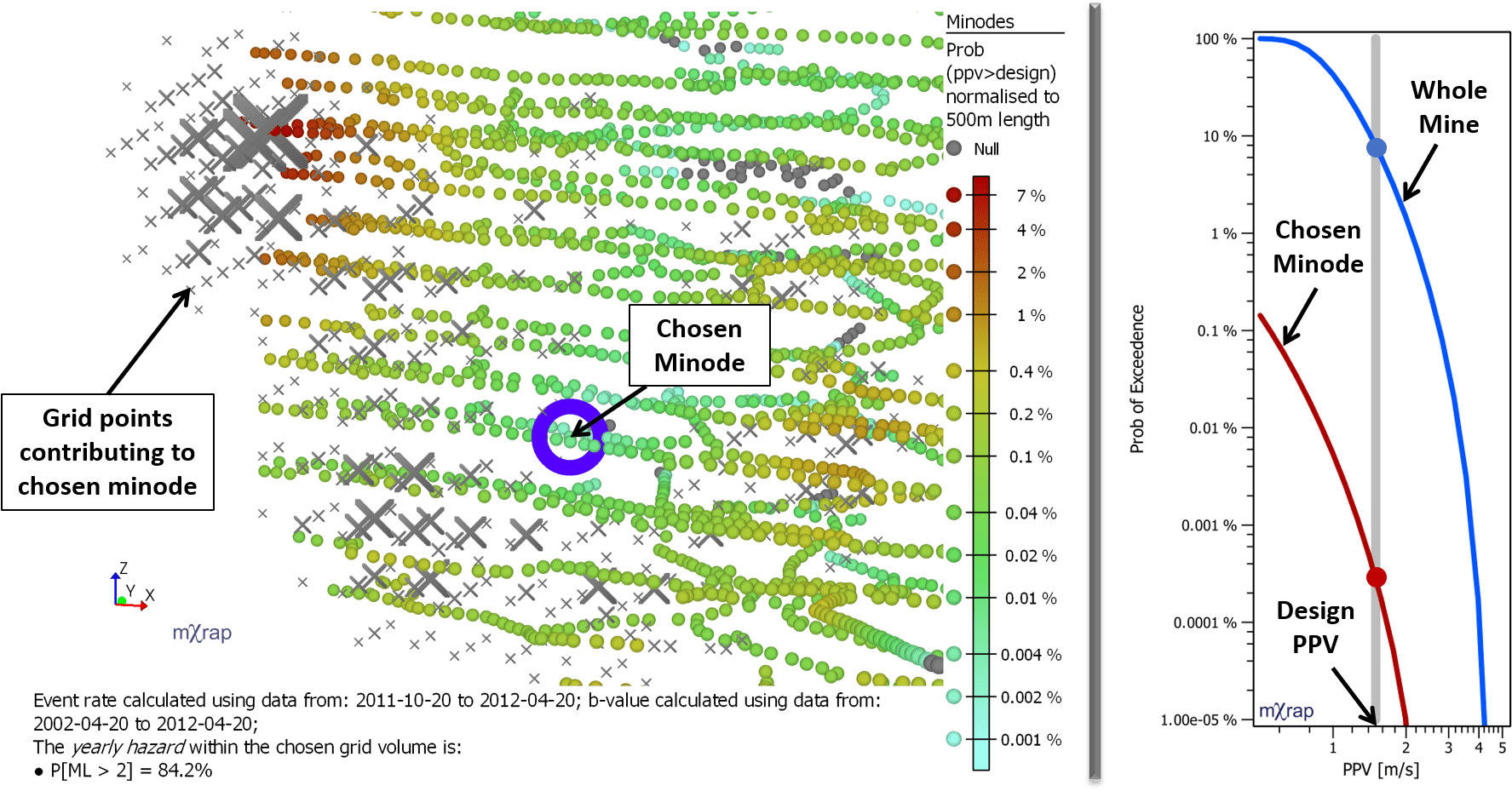 The PPV-Exceedance Probability chart is also shown in this window. This is useful for understanding the effect of integrating the hazard of multiple minodes together. The probability of exceeding the design PPV increases depending on how many minodes are considered. You can use selection boxes to query any group of minodes you like.