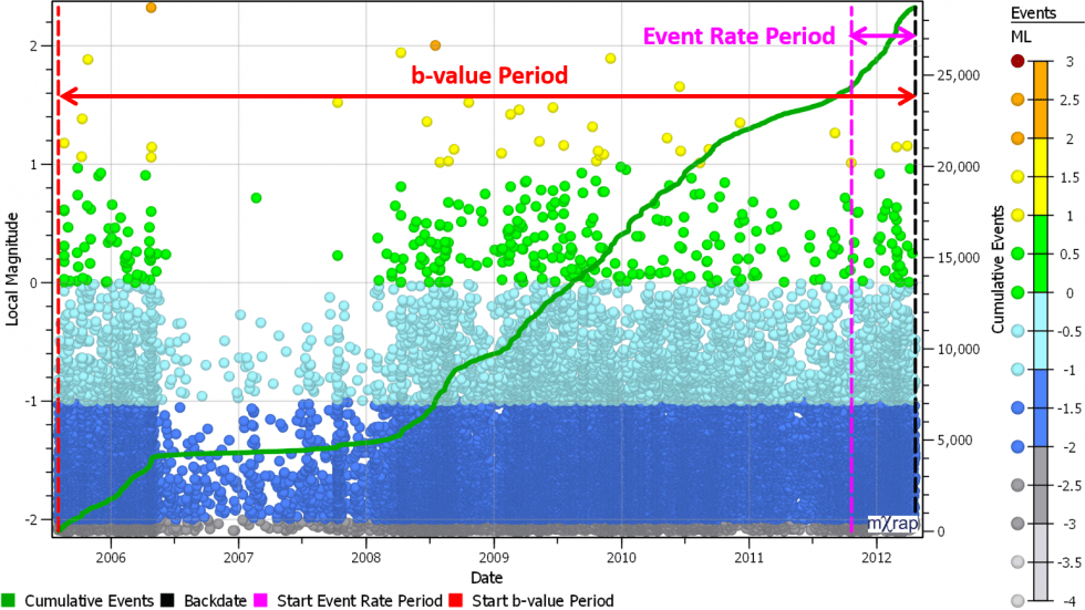 A few new features have been added to the Hazard Assessment application, aiming to improve usability, understanding and investigation. The first addition is a chart in the hazard setup window to indicate the current date range settings. Usually the date range for calculating b-value will be a lot longer than for calculating event rate. Hopefully the chart will be a handy visual aid to help you keep your bearings when setting the hazard analysis periods.