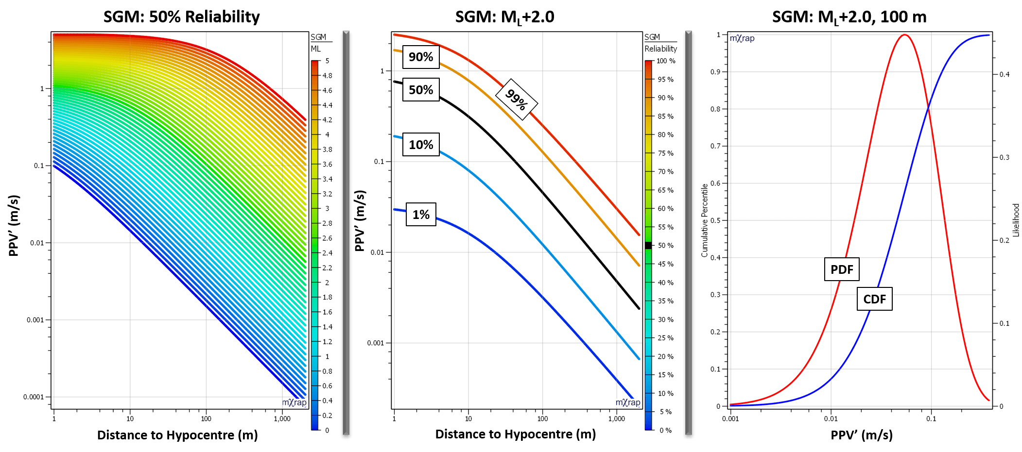 - Single Reliability (P) - This is the most traditional way of viewing the SGM relationship. The PPV is plotted against the distance to hypocentre (R) for various magnitudes. This chart uses a single reliability / probability of non-exceedance. Adjust the reliability in the control panel. Note: Probability of exceedance = 1 - Reliability.