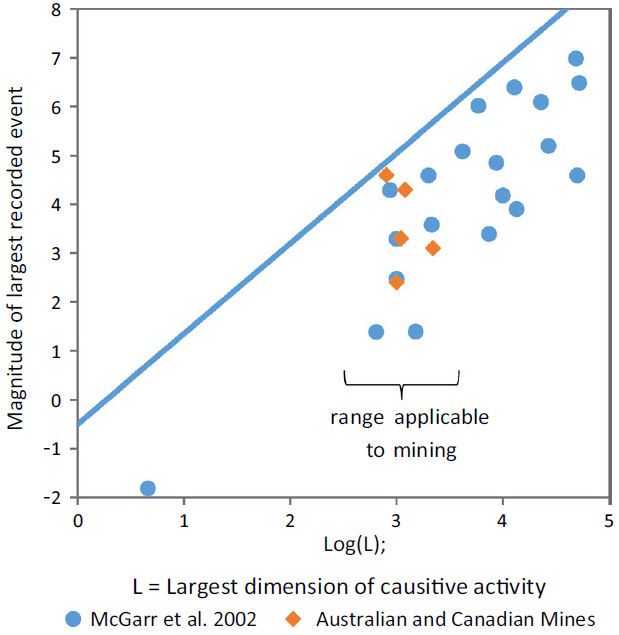 An empirical method of estimating can be taken using a dataset compiled by McGarr et al. (2002)1 of large events and the largest dimension of the human activity associated with them. The figure on the right comes from Wesseloo (2018)2 who added a few extra points to the dataset from Australian and Canadian mines. The range applicable to mining indicates rough dimensions between 500 and 5,000m.