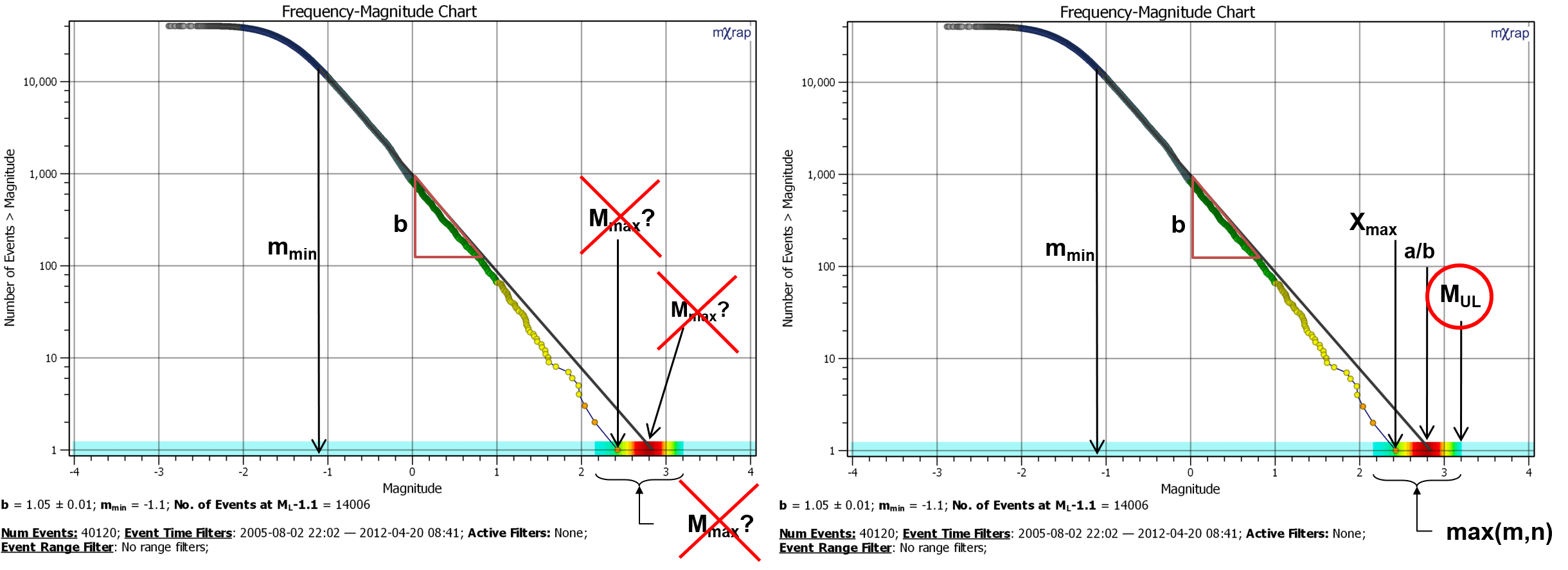 Yes, this is a frequently asked question.... or refers to the truncating magnitude of the Gutenberg-Richter distribution. We used to refer to this as Mmax in the Hazard Assessment app and on the frequency-magnitude chart but we found there was confusion caused by Mmax being used to describe multiple things. Hopefully if we refer to or the upper-limit magnitude, this will clear up the terminology a little.