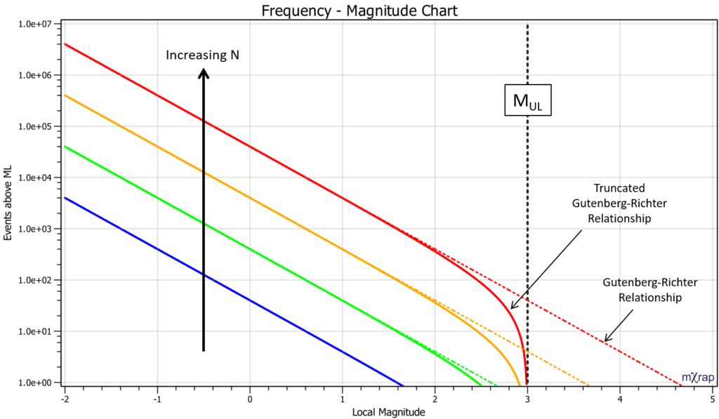 The truncated Gutenberg-Richter distribution, rather than the open-ended distribution, is the most common frequency-magnitude relationship used in mine seismology. If there is no upper limit given to the Gutenberg-Richter distribution, then to evaluate the total energy of events in the relevant time period, the energy tends to infinity as the relationship is integrated above Mmin. This is clearly unrealistic.