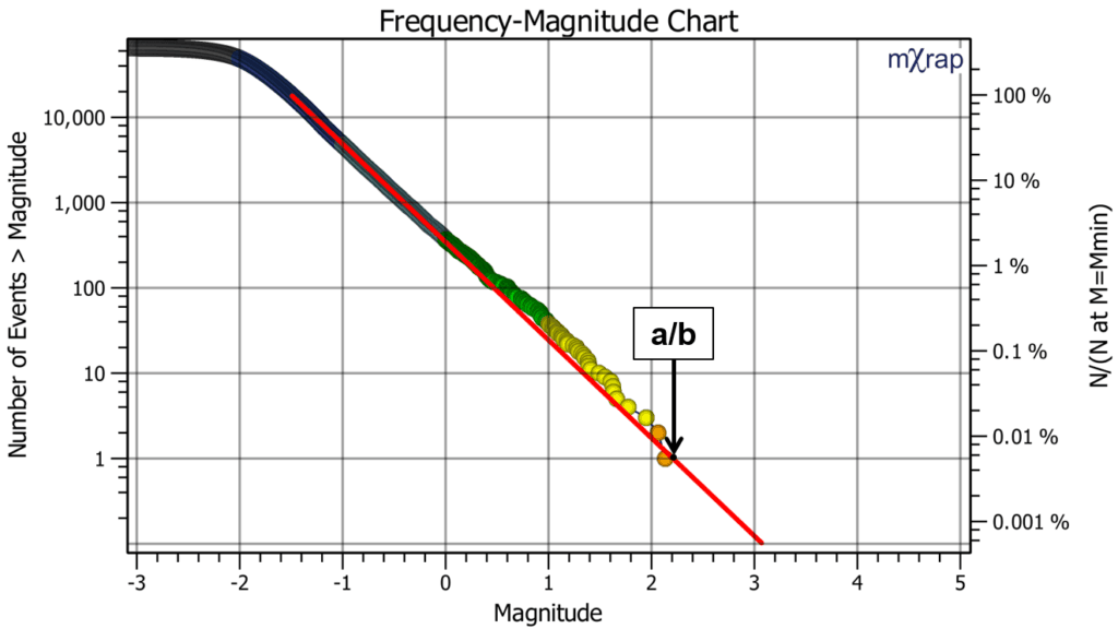 At N=1N=1, M=a/bM=a/b. The figure below shows an example of a frequency-magnitude chart with the a/ba/b value highlighted.