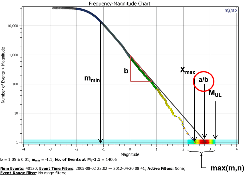 It is important to distinguish between properties of the dataset and properties of the statistical model. The a/ba/b value is a property of the Gutenberg-Richter statistical model but it is defined at a particular data point (N=1N=1). The a/ba/b value does have some meaning, but that's really only because the aa and bb value both mean something (although I'll come back to the aa-value later). In terms of seismic hazard, the activity rate and bb-value are the two primary inputs required.